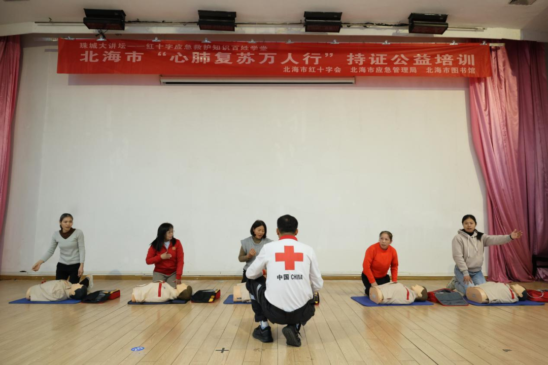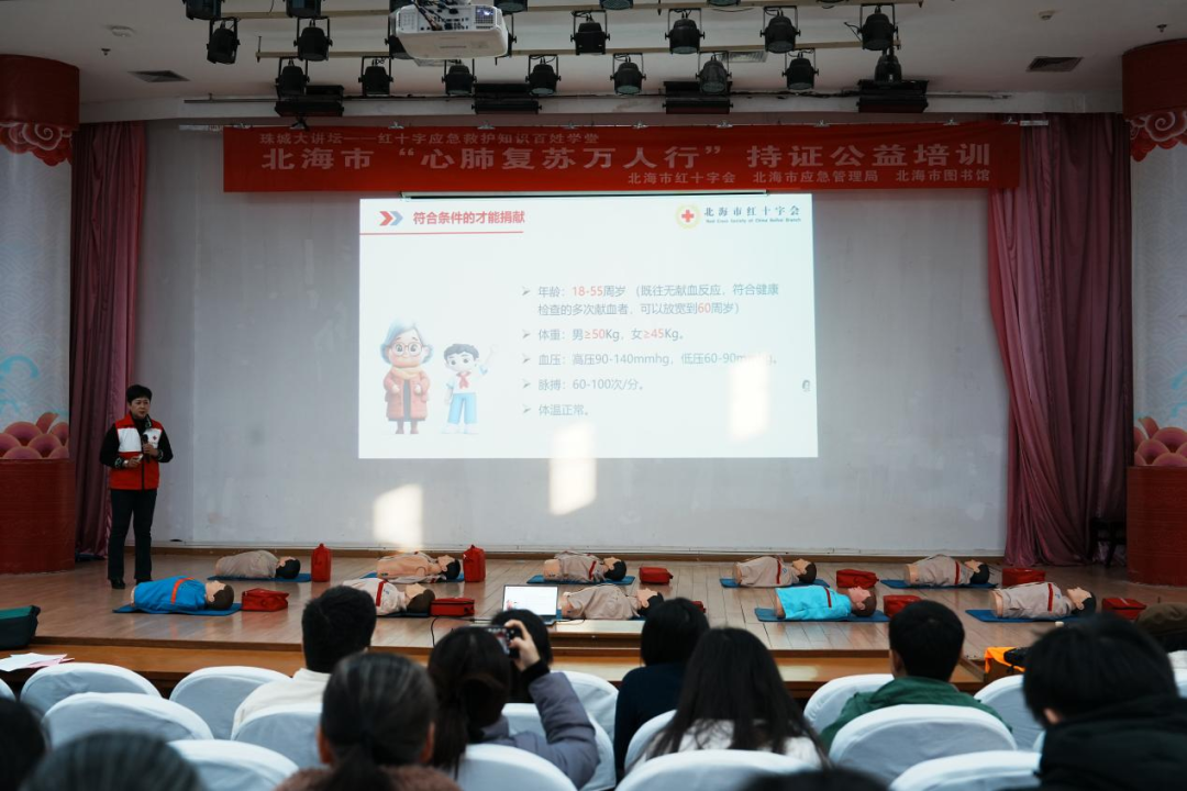 2月1日上午,北海市红十字会、北海市旅游文体局、北海市应急管理局、北海市图书馆联合主办的“珠城大讲坛——红十字应急救护知识百姓学堂”活动在市图书馆二楼报告厅举办。本次活动吸引了100余名市民参与,经过系统学习与严格考核,活动取得圆满成功。