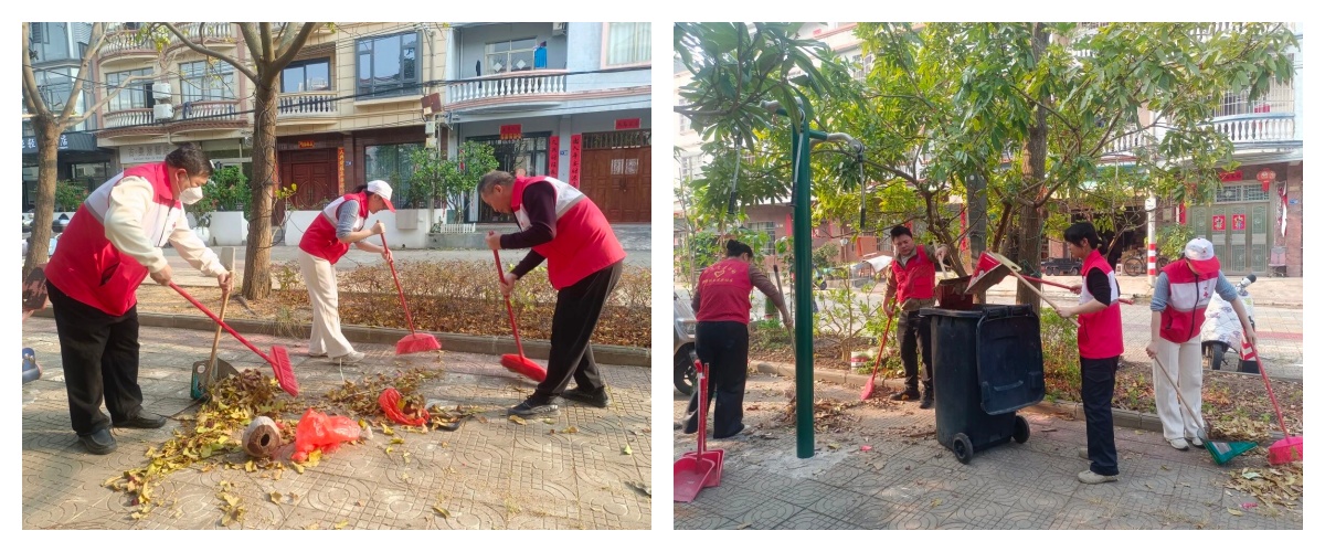 另一组党员手持扫帚、垃圾铲等工具,深入社区公共区域、绿化带及卫生死角,开展地毯式清理。大家齐心协力,清扫落叶杂物,清除积存垃圾,不放过任何一个角落。经过一番劳动,社区环境焕然一新,整洁有序迎新春。