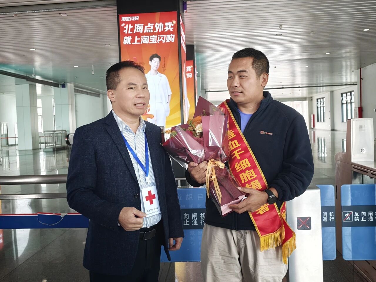 完成捐献返回北海时,小梁受到了英雄般的礼遇。市红十字会党组书记、常务副会长吴智祥和小梁所在单位负责同志亲自到站迎接,为他送上一束象征生命与希望的鲜花。这温馨的一幕,既是对小梁勇敢善举的最高礼赞,也是对他无私大爱精神的永恒见证。