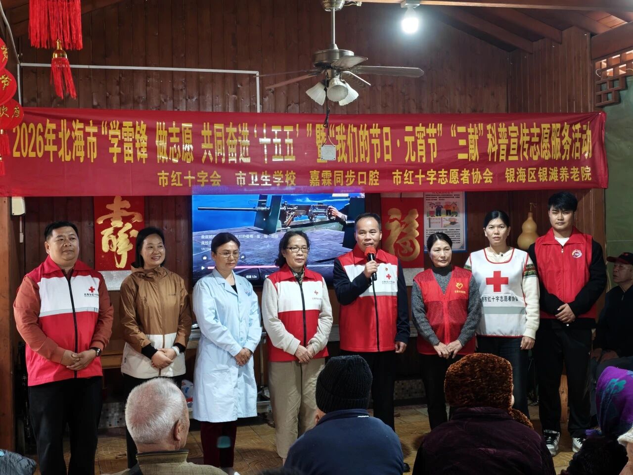 为弘扬雷锋精神和“人道、博爱、奉献”的红十字精神,2026年3月3日元宵佳节当天,北海市红十字会联合市卫生学校、市档案馆、市红十字志愿者协会等单位,在银滩养老院隆重举行2026年北海市“学雷锋 做志愿 共同奋进‘十五五’”暨“我们的节日·元宵节”“三献”科普宣传志愿服务活动。市红十字会党组书记、常务副会长吴智祥出席活动。