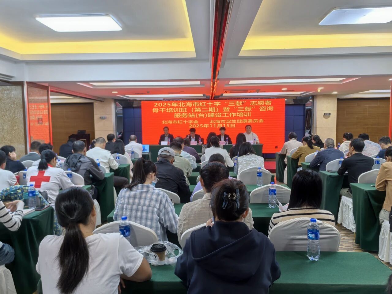 为进一步加强“三献”志愿服务队伍建设,深入贯彻落实《广西壮族自治区“三献”咨询服务站(台)标准化建设方案》,推动我市“三献”(无偿献血、造血干细胞捐献、遗体和人体器官捐献)事业高质量发展,2025年11月15日,北海市红十字会与市卫生健康委联合举办2025年北海市红十字“三献”志愿者骨干培训班(第二期)暨“三献”咨询服务站(台)建设工作培训。市红十字会党组成员、专职副会长伍海燕,市卫生健康委党组成员、副主任刘存军,中国造血干细胞捐献者资料库广西管理中心副主任冯晓春等出席开班仪式。