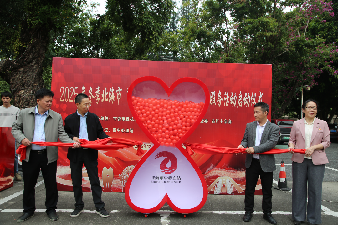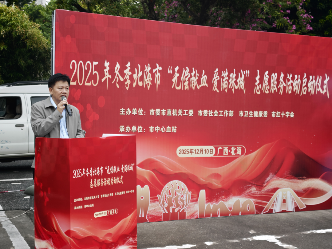 12月10日,2025年冬季北海市“无偿献血·爱满珠城”志愿服务活动在市政府机关大院正式启动,本次活动由市委市直机关工委、市委社会工作部、市卫生健康委、市红十字会联合主办,市中心血站承办。本次活动旨在弘扬无私奉献精神,动员更多市民群众参与无偿献血公益事业,切实保障冬季临床用血需求,传递城市温度与文明力量。市委市直机关工委副书记张以华,市卫生健康委党组成员、副主任刘存军出席活动启动仪式并讲话,市委社会工作部副部长许荣远、市红十字会一级调研员冯向红出席启动仪式,并共同启动“无偿献血·爱满珠城”志愿服务活动。市中心血站党支部书记、站长陈忠如主持启动仪式。