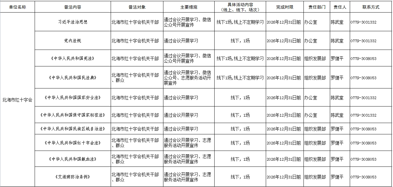 北海市红十字会2026年“谁执法谁普法、谁管理谁普法、谁服务谁普法”任务措施清单公示