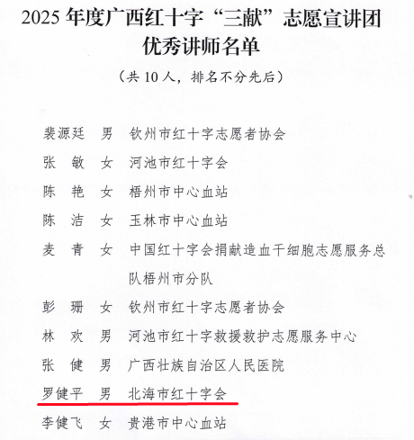 罗健平同志长期扎根“三献”公益事业,积极宣传无偿献血、造血干细胞捐献、遗体和人体器官捐献知识,深入基层开展志愿宣讲,动员社会各界关注、支持、参与“三献”工作,为传播红十字精神、挽救生命健康作出了积极贡献。此次获奖,既是对他个人专业素养与奉献精神的高度认可,也是对北海市红十字会“三献”工作的有力肯定!