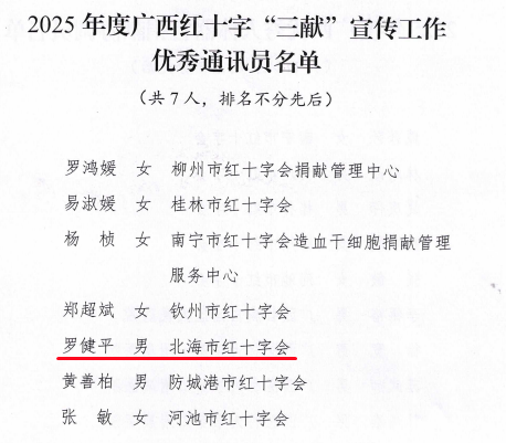 近日,自治区红十字会印发《关于通报表扬2025年度“三献”工作优秀个人的通知》(桂红字〔2026〕5号),对在2025年度全区“三献”工作中贡献突出的优秀个人进行通报表扬。其中,北海市红十字会组织发展部部长罗健平同志凭借在“三献”宣传和志愿宣讲工作中的突出表现,同时荣获2025年度广西红十字“三献”宣传工作优秀通讯员、广西红十字“三献”志愿宣讲团优秀讲师两项殊荣!